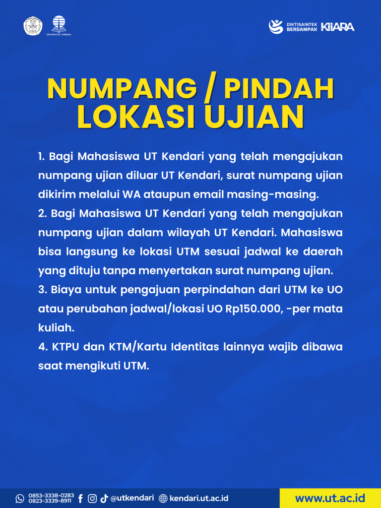 Numpang ujian adalah fasilitas yang diberikan UT kepada mahasiswa yang ingin mengikuti ujian di lokasi berbeda dari tempat registrasi awal. Alasan umum meliputi: